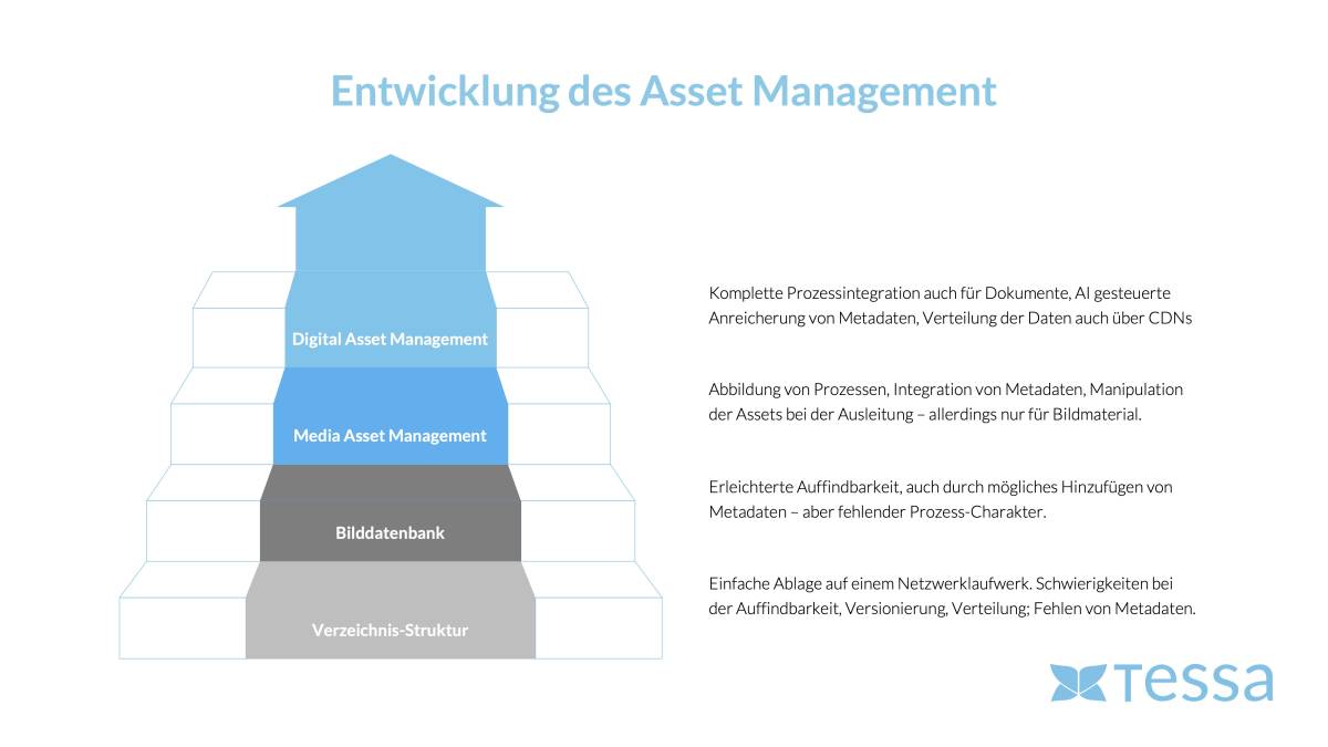 Im Vergleich zu dieser weitgehend noch analogen Zeit vor dem Aufkommen des Internet hat sich sehr viel geändert: Auf Websites werden erheblich mehr Fotos gezeigt, als früher in Katalogen zu sehen waren; Unternehmen wie About You zeigen auch noch Videos für viele ihrer Produkte. Es gibt 3D-Spins von allen erdenklichen Produkten, Kunden erwarten zu technischen Produkten Bedienungsanleitungen, Aufbauhilfen, Normdokumente und Zertifikate etc. Sowohl die Gesamtzahl der zu verwaltenden Assets als auch die Arten unterschiedlicher zu organisierender Assets hat sehr stark zugenommen.