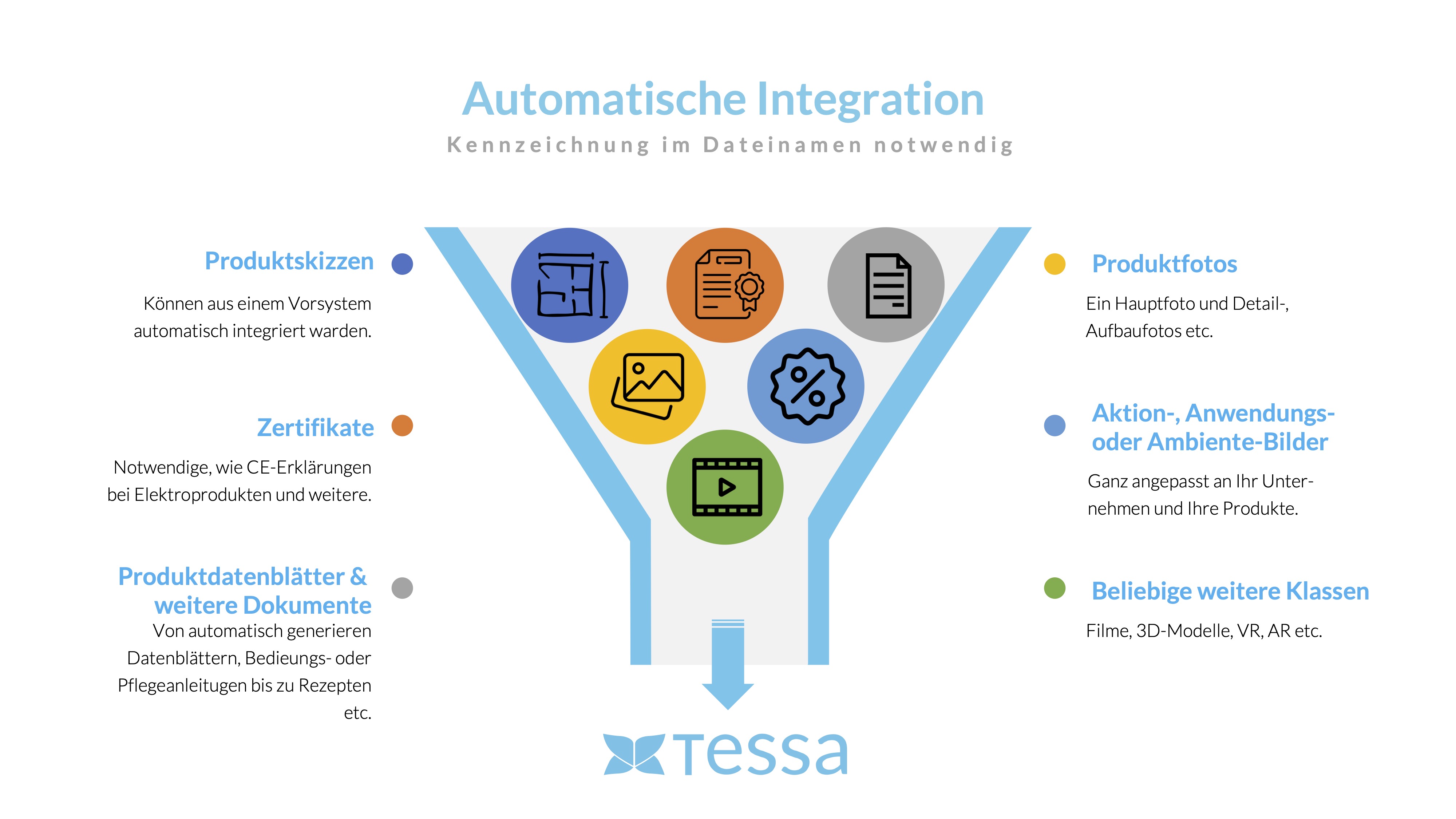 Meistens handelt es sich bei Assets ohne Produktbezug um Fotos, Logos, Templates für Präsentationen oder Anzeigen, mitunter auch Kataloge oder Broschüren. Eine allgemeine Klassen-Struktur dieser Assets ist schwer erkennbar. Oft kommen Unternehmen hier mit einer sehr langen, sehr unübersichtlichen Liste an Assets auf zu uns. Wir erarbeiten dann, wenn erforderlich, gemeinsam mit dem Kunden eine für die späteren Nutzer des TESSA DAM zugängliche Struktur. Dies ist einer der Enterprise-Vorzüge des TESSA DAM. Das Tool ist an die jeweilige Struktur Deines Unternehmens anpassbar. Freilich gibt es einige Anforderungen, die erfüllt werden müssen, damit alles reibungslos läuft. Dies beginnt mit einer sinnvollen Struktur der Dateinamen.