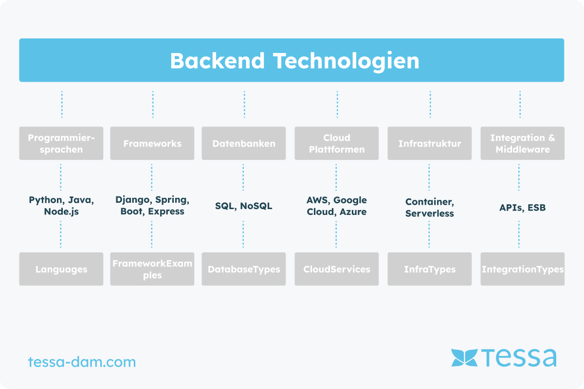 Die Auswahl der Technologien und Plattformen bildet das Fundament für leistungsstarke Backend-Systeme im Bereich Produktinformationsmanagement (PIM), Content-Management-Systeme (CMS) und Digital-Asset-Management (DAM). Diese Entscheidungen beeinflussen maßgeblich die Flexibilität, Skalierbarkeit und Sicherheit der Systeme sowie ihre Fähigkeit zur Integration mit anderen Diensten und Anwendungen. Im Folgenden werden die Schlüsseltechnologien und -plattformen vorgestellt, die in modernen Backend-Systemen für PIM, CMS und DAM zum Einsatz kommen.