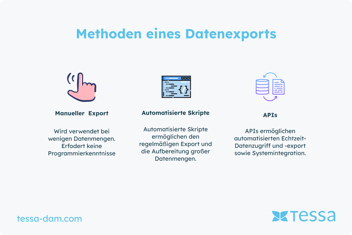 Der Datenexport ist nicht nur auf einfache Datenbanktabellen beschränkt. Er umfasst auch die Übertragung von komplexeren Datensätzen und digitalen Assets, wie Bilder, Videos und Dokumente, die in Digital Asset Management (DAM)-Systemen gespeichert sind. Diese Daten können in verschiedene Zielsysteme exportiert werden, um für Analysen, Berichte oder die Weiterverarbeitung genutzt zu werden. Weitere Information zu dem Spezialfall Datenexport und DAM erfolgt später im Text.