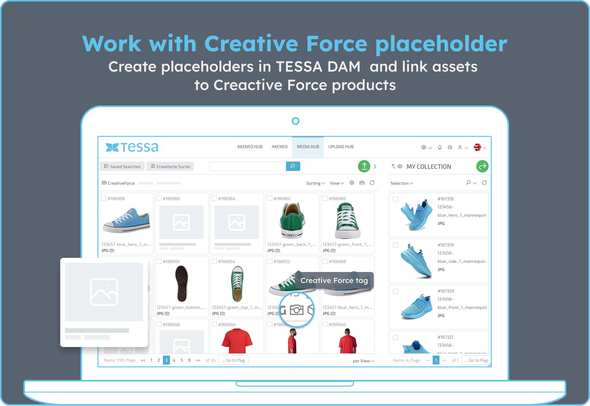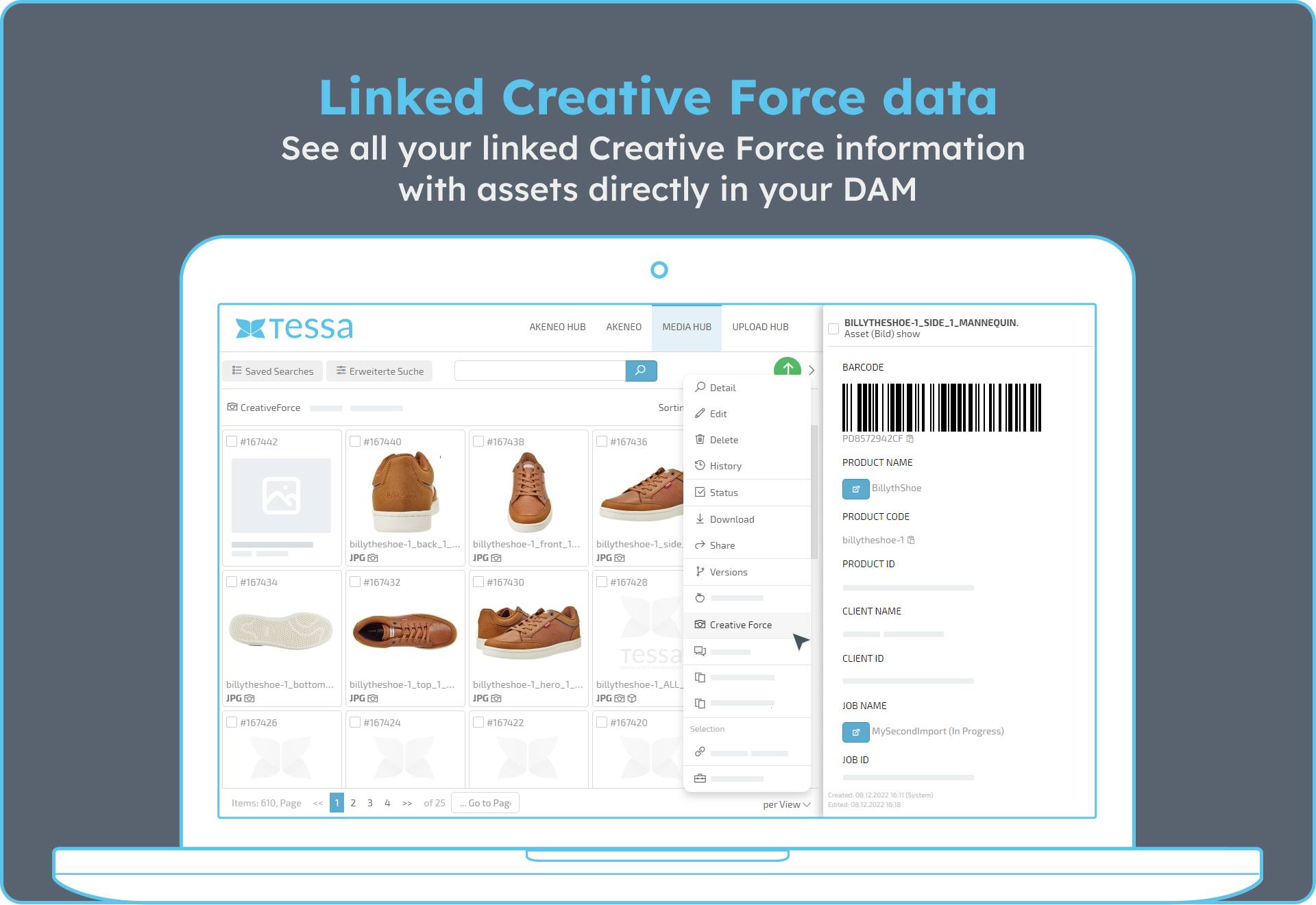With our TESSA Creative Force connector, we enable a smooth data exchange between both systems. You can automatically upload the assets you need and the associated metadata from Creative Force to DAM and vice versa.