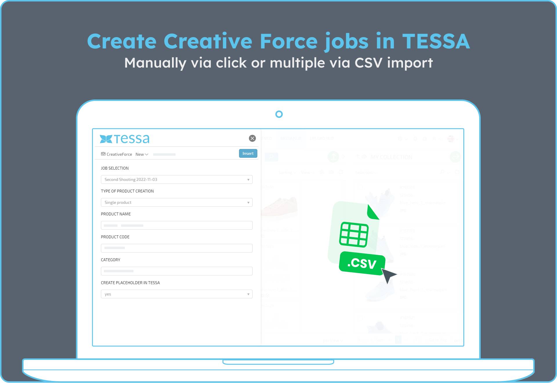 - You can create your required products and jobs via a dialog in TESSA DAM. Single data manually or several via CSV.
