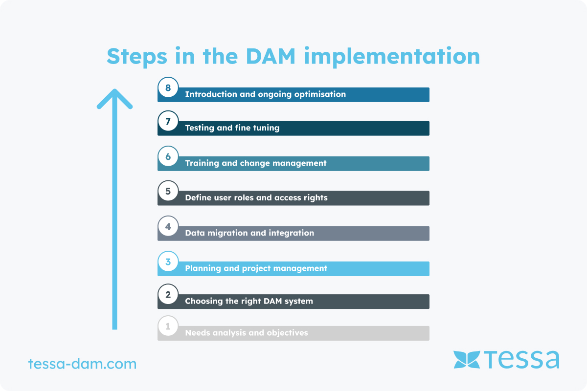 After learning about the benefits and motivations for implementing a Digital Asset Management (DAM) system, we would like to guide you through the essential steps of implementing such a system. The implementation of a DAM requires careful planning and execution to maximize its benefits. Here are the steps you should consider: