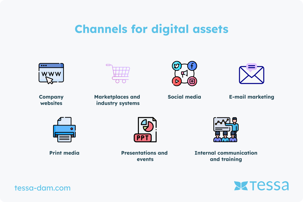 Now that you're familiar with the different sources of digital assets, let's explore the various types of assets you can manage in your Digital Asset Management (DAM) system. The diversity of digital assets is vast, and it is crucial to categorize and manage them correctly to optimize their use. Here are the main types of digital assets you can organize in your DAM system, such as TESSA: