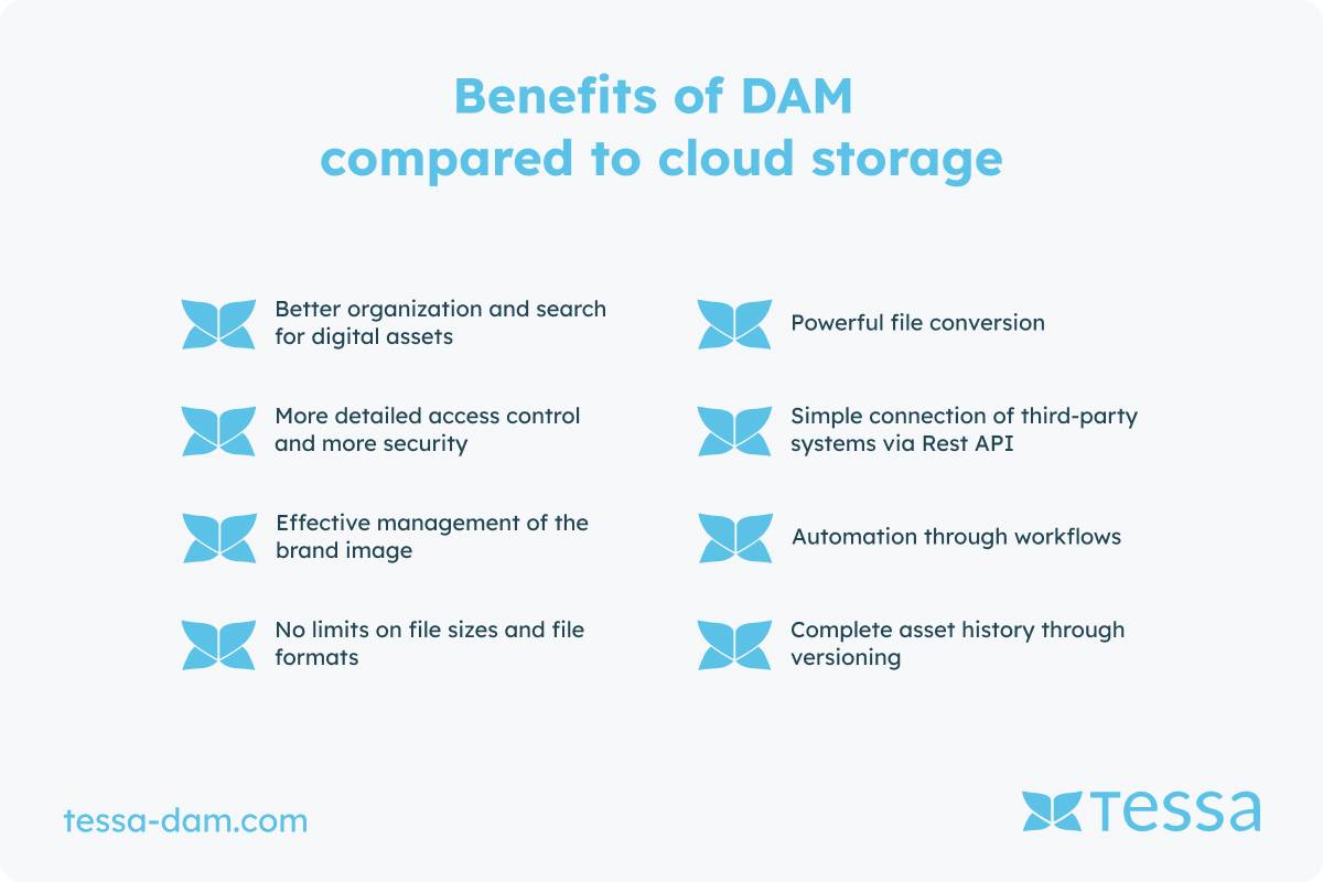 The advantages of digital asset management (DAM) compared to cloud storage are manifold and offer a range of functions that are specifically tailored to the needs of digital content management.
