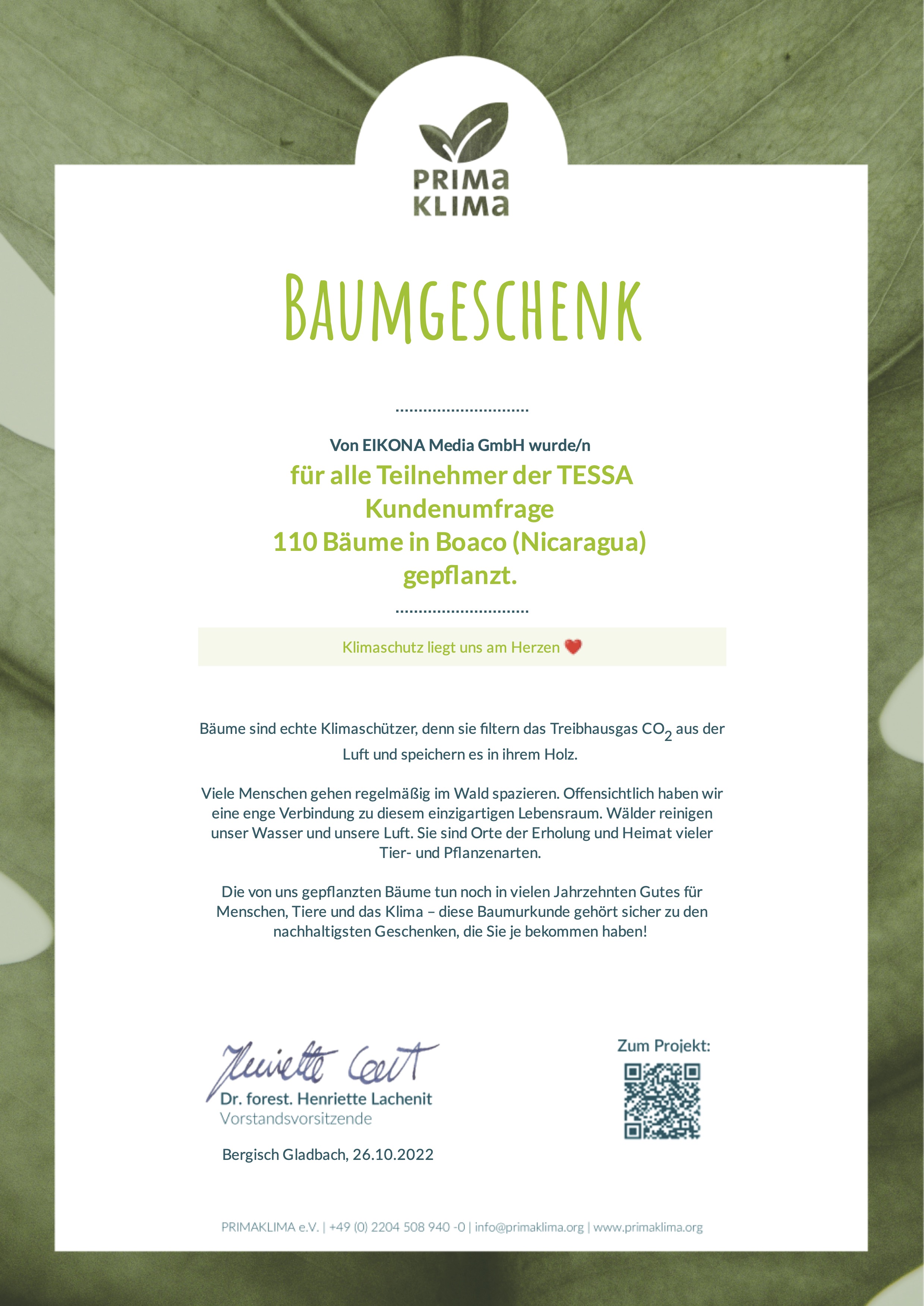 PRIMAKLIMA is a non-profit organization founded in 1991, dedicated to active climate protection and the preservation and expansion of forests. These forests are indispensable as climate protectors; therefore, PRIMAKLIMA has planted 13.5 million trees worldwide. Forests naturally lower the CO₂ content in the atmosphere and act as a carbon store within ecosystems. A holistic approach is essential for their work, which is why projects span four continents. These efforts contribute to the economic, social, and ecological development of their respective regions. PRIMAKLIMA’s vision is for everyone to take responsibility for the climate—one of the main reasons we chose this organization.